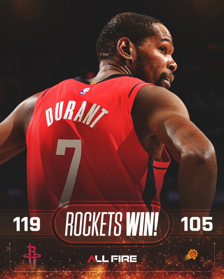 04月 10 2026 0 7连胜以7号为封面!火箭官方赢球海报封面人物——杜兰特 xiaoqiao 2026-04-10 法甲 7 4月8日讯 NBA常规赛,火箭119-105战胜太阳。赛后火箭官方晒出本场赢球海报,封面人物是杜兰特。本场比赛,火箭球星杜兰特首发出战36分钟,投篮20中8,三分球9中5,罚球3中3,拿到24分4篮板3助攻。